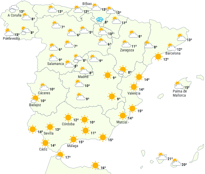 Det forventes, at stabiliteten fortsætter på størstedelen af Den Iberiske Halvø med overvejende klar himmel, bortset fra i nord, hvor der vil være skydække og mulighed for lejlighedsvis svag regn - særligt i slutningen af dagen i det vestlige Galicien.