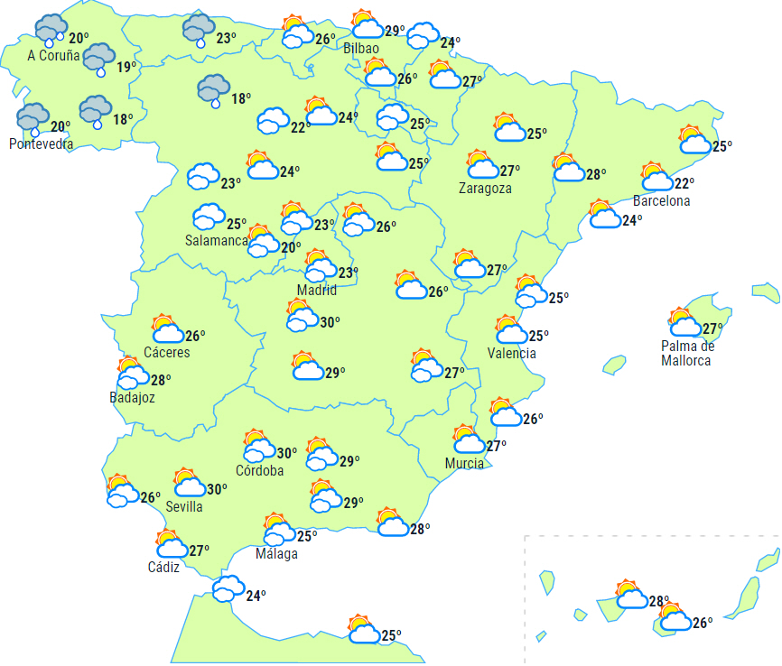 Dagstemperaturerne vil generelt forblive uændrede på halvøen og Balearerne. Nattemperaturerne vil sandsynligvis også forblive uændrede, undtagen i højtliggende områder af højlandet, hvor de kan falde kraftigt. De kommer fortsat ikke under 20 grader i den østlige ende af nordvestkysten.