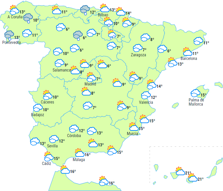 Temperaturerne falder i den nordvestlige del af Galicien og stiger generelt lidt i resten af landet. Svag frost i det indre af den østlige halvdel af halvøen og noget kraftigere i den sydlige del af De Iberiske Randbejrge og i Pyrenæerne.