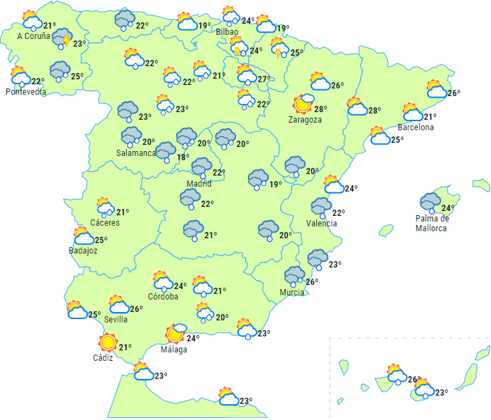 Overskyet i perioder på resten af halvøen og Balearerne med mulighed for nogle byger og tordenvejr, dog af svagere karakter.