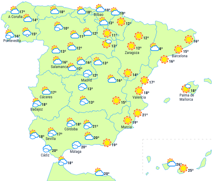 Skyet himmel med tendens til letskyet sidst på eftermiddagen. Tåge og dis om morgenen. Minimumstemperaturer med små ændringer, mens maksimumstemperaturerne stiger, især i bjergene. Dermed lander vi på 20 til 24 grader og 11 til 14 i nat.