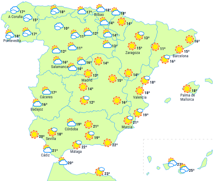 Imidlertid forventes en Atlanterhavsfront at trænge ind over halvøen og give vekslende skydække over den vestlige halvdel og skyet eller overskyet himmel med lejlighedsvis nedbør ledsaget af tordenvejr i Galicien. Det er heller ikke udelukket, at det kan nå dele af Asturien og den vestlige del af Castilla y León og Extremadura.