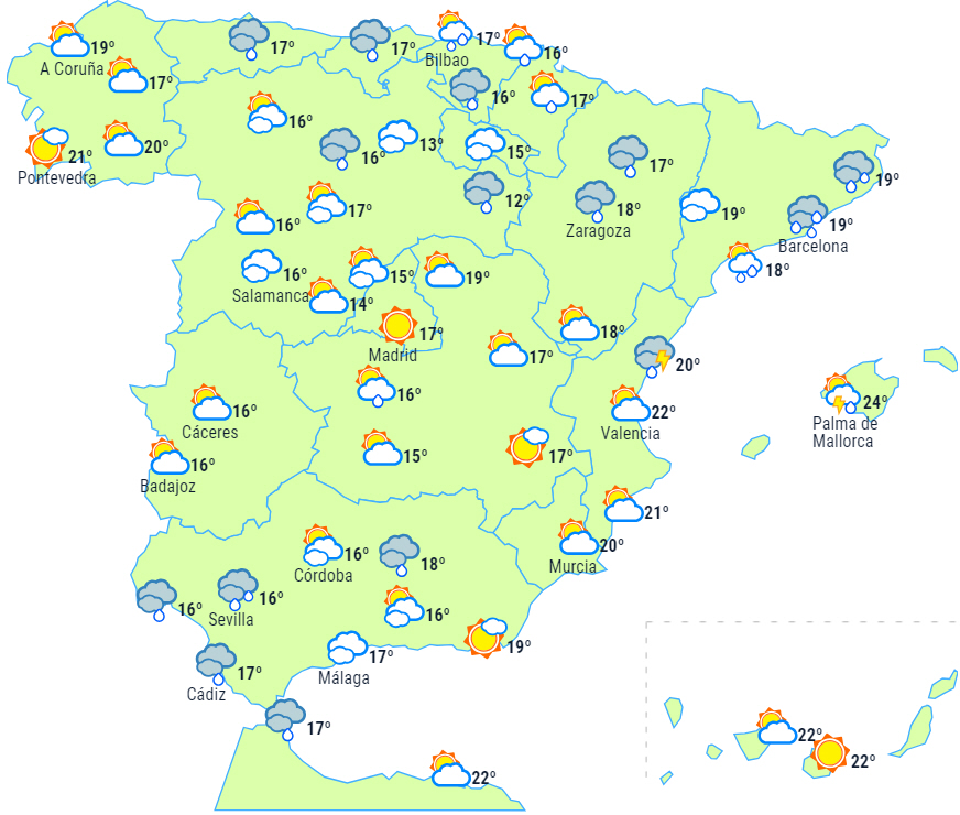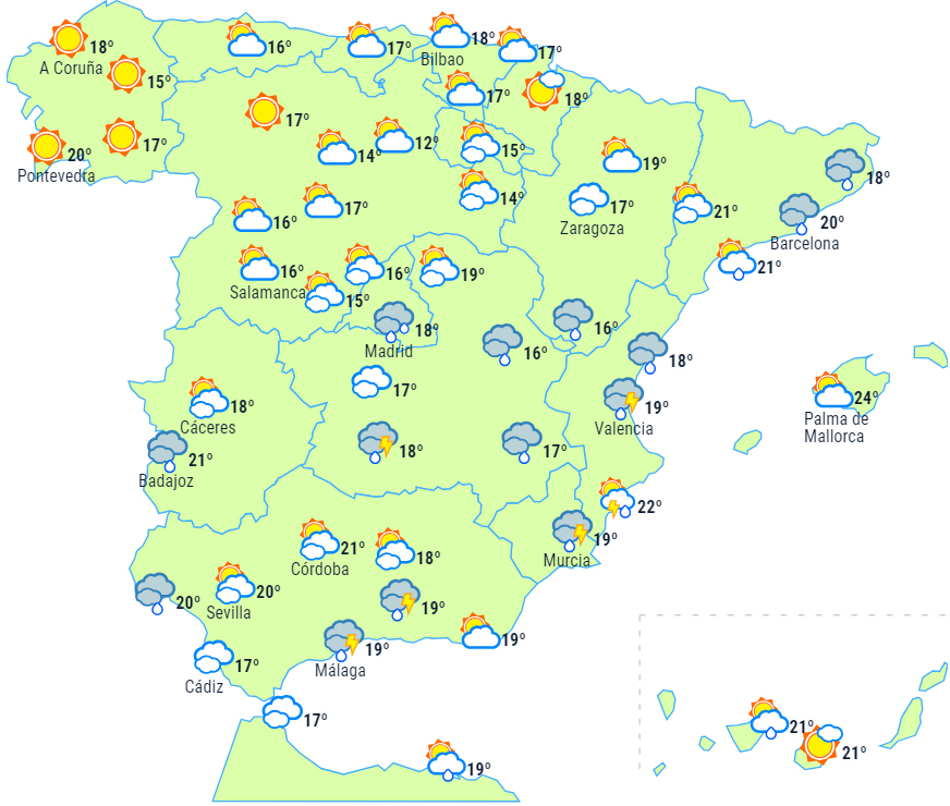Varsler om byger og tordenvejr, der lokalt vil være kraftige og/eller vedvarende i Girona, den østlige del af De Iberiske Bjerge, det østlige af det sydlige højland, Levante-området, sydøstlige og helt sydlige af halvøen og måske endda meget kraftig nedbør i det indre af Valencia og nogle steder på den sydlige halvdel. Her til formiddag har Aemet endda opgraderet alarmen til allerhøjeste niveau på Valencias sydkyst på grund af voldsomme regnskyl, der allerede har givet 150 mm.