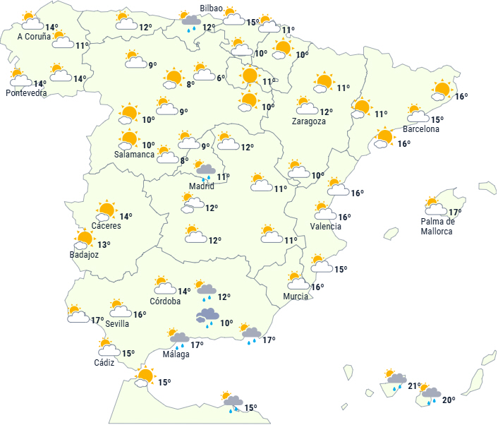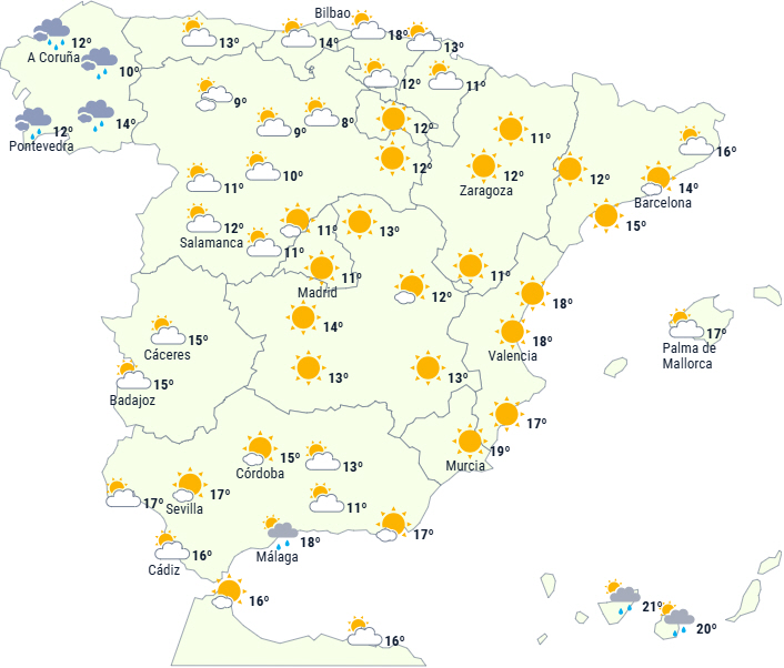 På resten af halvøen og De Baleariske Øer forventes rigeligt med skydække i starten af dagen, hvilket kan efterlade lidt let regn i områderne langs Det Cantabriske Hav, men også her er der tendens til opklaring efterhånden.