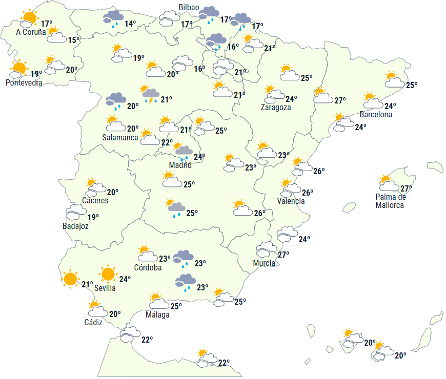 Fra middagstid vil der komme flere skyer med byger og torden i store dele af indlandsområderne, hvor det er sandsynligt, at de bliver kraftige og til tider ledsages af hagl og meget kraftige vindstød i store dele af begge højlandsområder og tilstødende områder samt i dele af det østlige indre af halvøen, bjergkæder i det nordøstlige Andalusien, Ebro-dalen og især i området omkring De Iberiske Bjerge, hvor de som nævnt kan blive blive særligt kraftige.
