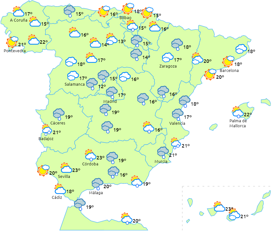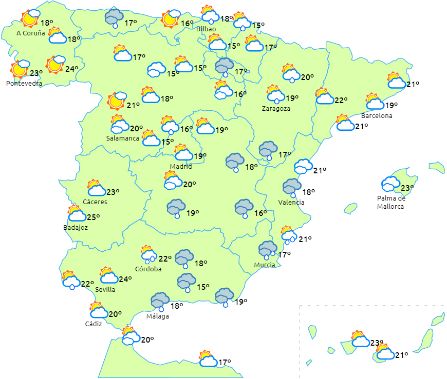 Skyet med let regn i det nordlige Galicien og Cantabrien. Skyet eller overskyet himmel over den østlige tredjedel af halvøen med stedvis kraftige regn- og tordenbyger, som kan være meget kraftige eller vedvarende i dele af Valencia.