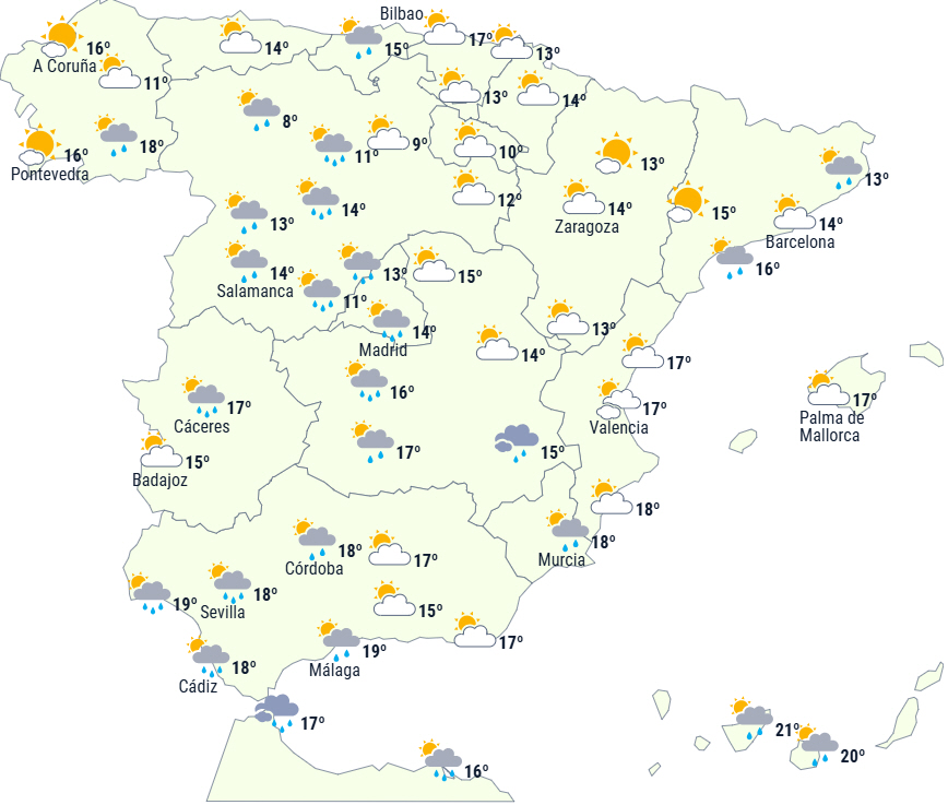 Den ustabile vejrsituation fortsætter med overvejende skyet eller overskyet himmel og udbredt nedbør, især over den sydlige og østlige del af Den Iberiske Halvø, hvor nedbøren kan være kraftig på visse steder i det sydvestlige Andalusien, og desuden vedvarende mellem Cabo de la Nao og Ebro-dalen, samt i den østlige del af Gibraltarstrædet.