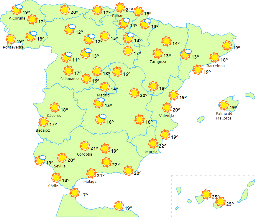 Tørt og stabilt vejr til hele landet. I begyndelsen er der dog overskyet eller delvist overskyet i Galicien, Pyrenæerne og i halvøens indre områder samt på i Cadiz-bugten og Alboran-bugten, men det klarer op i løbet af dagen.