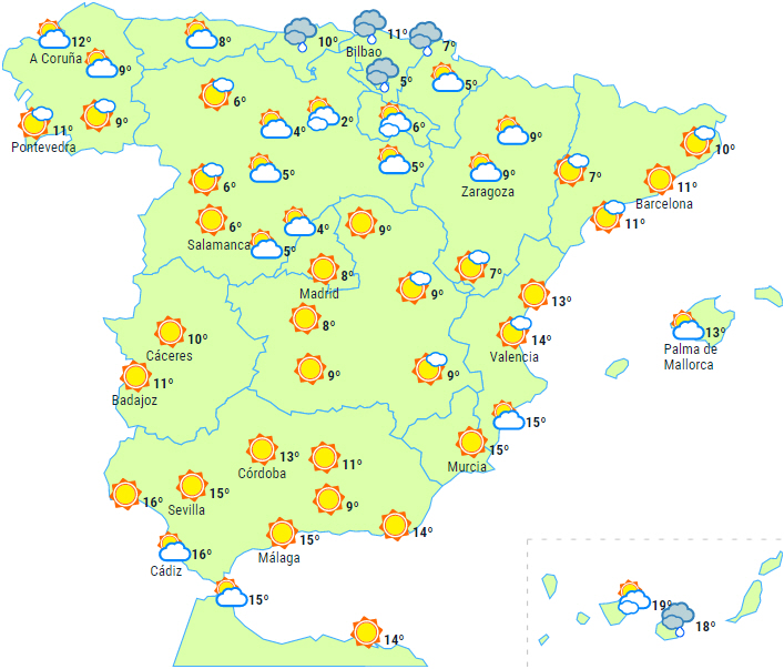 Dagstemperaturerne stiger på halvøen og Balearerne, mens nattemperaturerne stiger i Gibraltarstrædet og på Balearerne og falder på den nordlige halvdel af fastlandet. Kun få ændringer i resten af landet. Udbredt frost i det indre af halvøen og tung frost i Pyrenæerne og lokalt også i visse andre bjergsystemer på den nordlige del af halvøen.