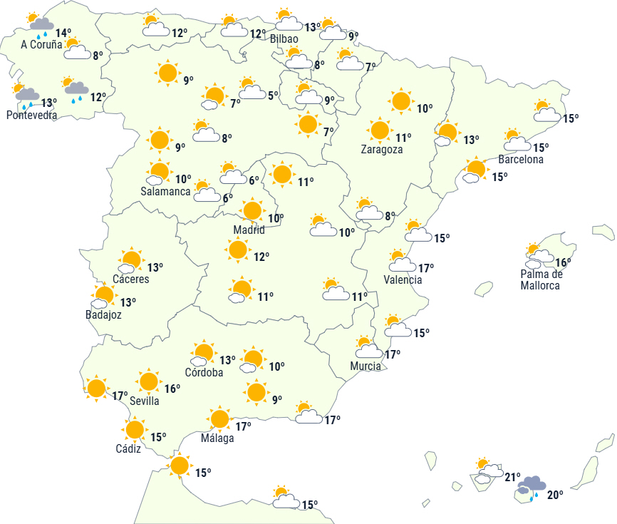 I dag bliver påvirket af resterne af den koldfront, der er forbundet med vinterstormen Ivo, der bevæger sig ind over fransk territorium mod Middelhavet, og den vil stadig påvirke områder i halvøens indre egne.