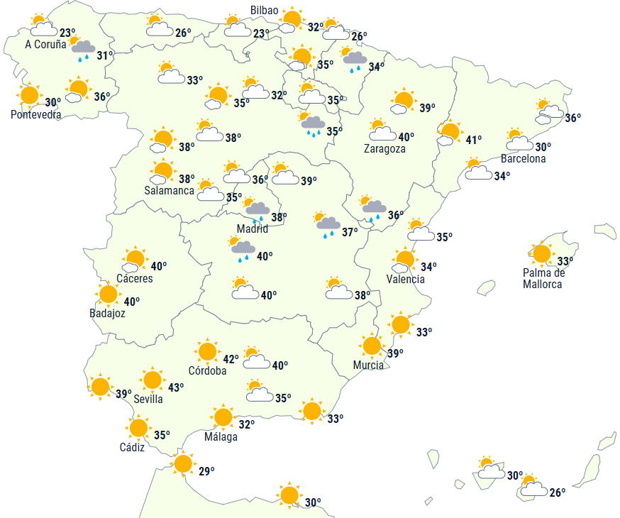 Dagstemperaturerne er i let stigning på den nordøstlige del af Den Iberiske Halvø, den nordlige middelhavskyst og De Baleariske Øer, dog mere markante stigninger i det østlige Cantabrien, mens der i resten af Den Iberiske Halvø og De Kanariske Øer ventes lette fald, som vil være tydelige på den nordvestlige kyst af Galicien. Alligevel forbliver niveauerne som nævnt ualmindeligt høje.