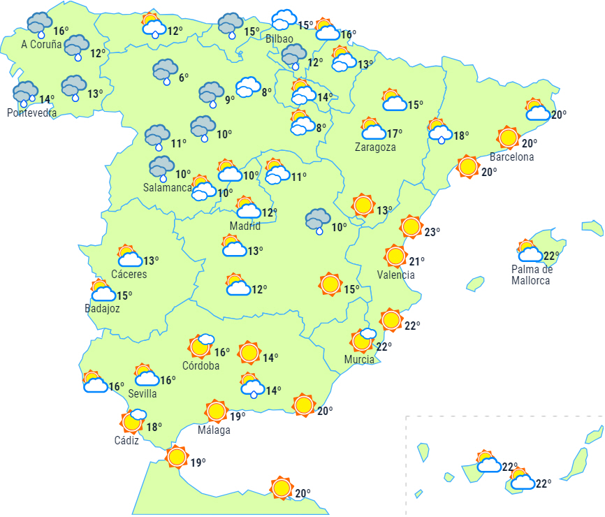 Der forventes nedbør i Galicien, og i en svagere form og fra vest mod øst vil nedbøren også ramme næsten hele resten af halvøen og De Baleariske Øer, dog mere spredt i Middelhavsområdet.