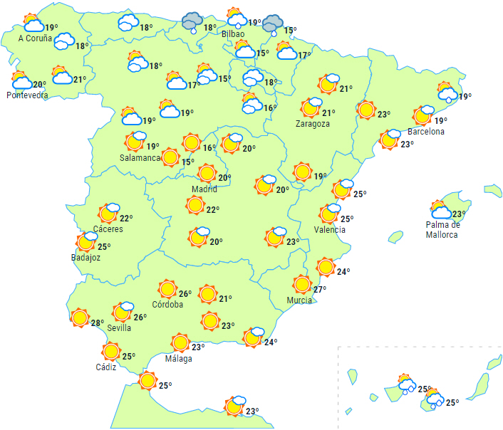 I begyndelsen af dagen også overskyet over den østlige del af Catalonien, Balearerne og Melilla med sandsynlighed for regn- og tordenbyger, som lokalt kan være kraftige på kysterne af Catalonien og Balearerne, men med mere vekslende skydække og pletvis opklaring i løbet af dagen.