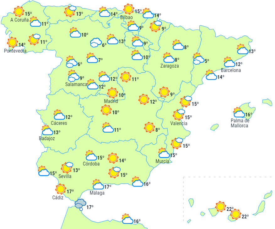 Dagstemperaturerne sker der ikke så meget med, bortset fra stigninger i de indre områder af den østlige del af fastlandet, det vestlige Galicien og den øvre Ebro-dal, og lette fald på de østlige af De Kanariske Øer, dele af det nordlige højland og de nordøstlige dale, hvor tågen vil være mere vedholdende.