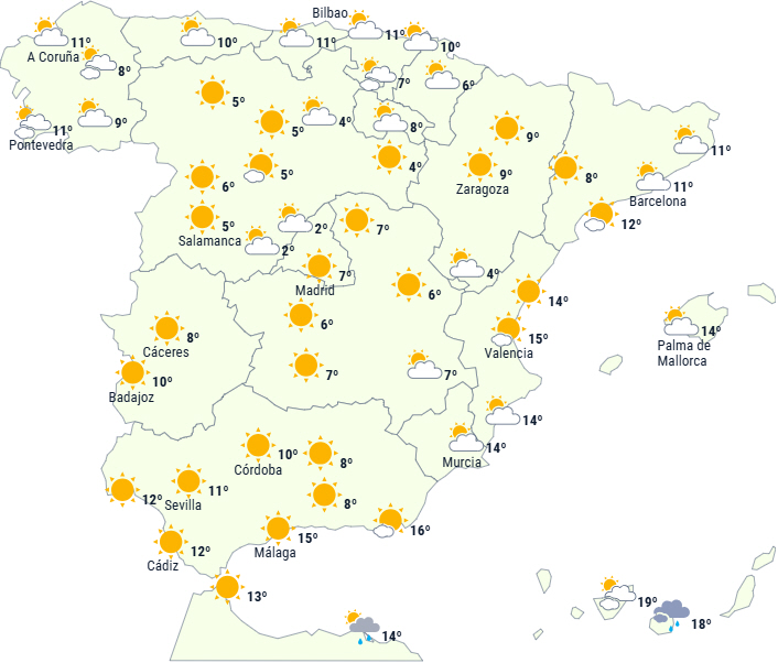 Nordenvinden vil fortsætte med at påvirke det helt nordlige af fastlandet med let nedbør i den østlige ende af områderne langs Det Cantabriske Hav, det østlige Galicien, det nordlige af De Iberiske Bjerge og Pyrenæerne, men det klarer i nogen grad op i løbet af dagen.