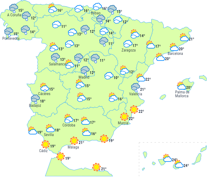 Stadig lidt ustadigt, men vinden aftager, og det giver efterhånden mere stabilt vejr til både halvøen og De Baleariske Øer, så nedbøren aftager. I Galicien vil skyerne dog tage til, og nedbøren vil sprede sig fra vest mod øst, og sidst på dagen vil den være mere intens i den vestlige del af regionen, endda lokalt kraftig og ledsaget af tordenvejr på kysten.