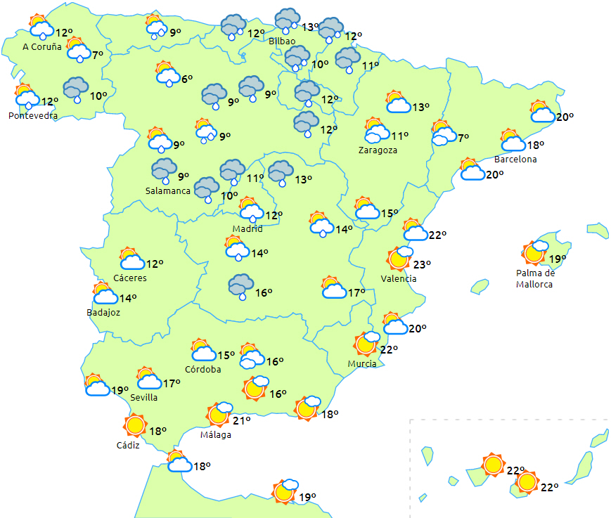 Temperaturerne stiger i Middelhavsområdet og ved den nedre del af Ebro-dalen, mens de falder i resten af landet. Svag frost til sidst på dagen i alle bjergsystemer på halvøen, men mest intens i Pyrenæerne.