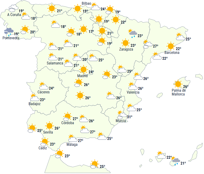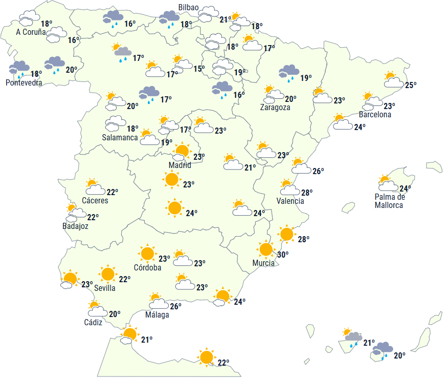 Dagstemperaturerne falder i Galicien, på De Baleariske Øer og i det indre af den nordøstlige del af halvøen, hvor faldet lokalt kan være markant. Til gengæld stiger de i Cantábrico, den øvre del af Ebro-dalen og på størstedelen af den sydlige halvdel af halvøen, mens de forbliver uændrede i resten af landet. Vi kan komme over 35 grader i enkelte områder af Valencia Regionen.