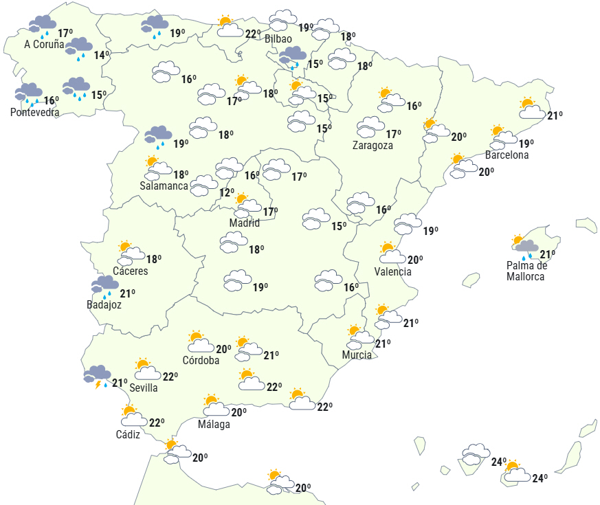 Det forventes, at en atlanterhavsfront giver skyet eller overskyet himmel over den nordvestlige del af Den Iberiske Halvø og Cantabrien, og det giver nedbør i særligt Cantabrien, Asturien, den nordvestlige del af Castilla y León og især Galicien, hvor der i dens vestlige halvdel forventes at få betydelige mængder plus noget torden og måske endda hagl mod slutningen af dagen.