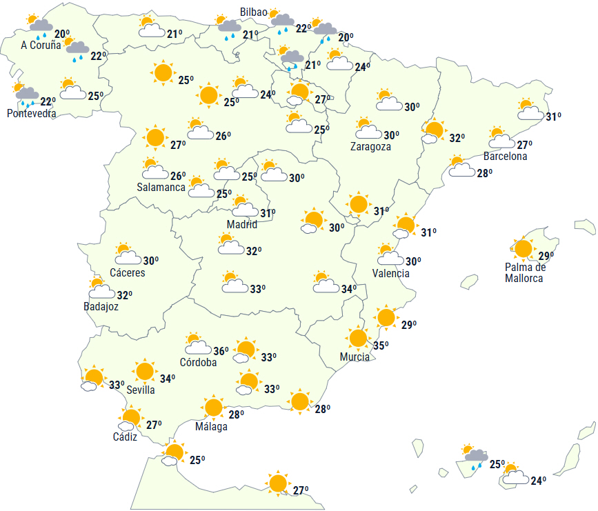 Dagstemperaturerne kan overstige 35 grader i Guadalquivir og sydøstlige dale, mens nattemperaturerne ikke falder til under 20 grader i Middelhavsområdet og Guadalquivir.
