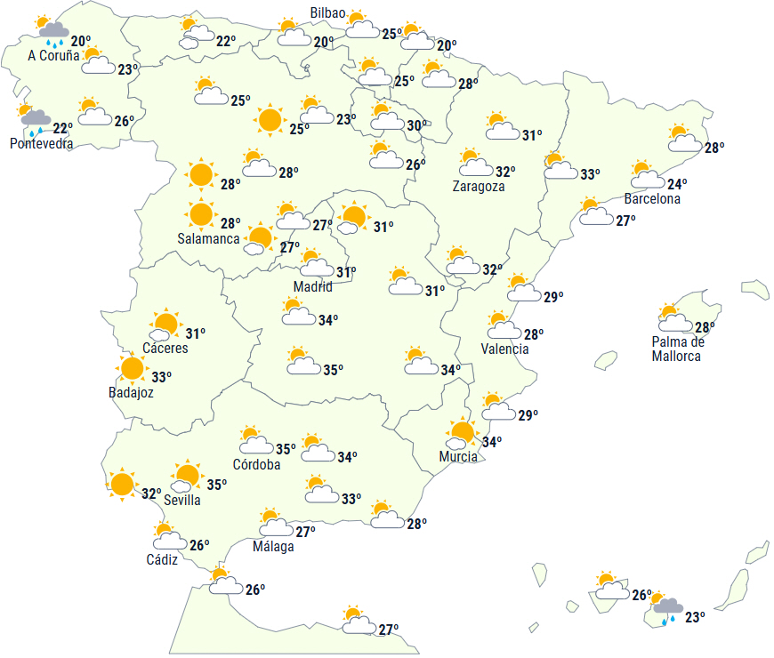 Dagstemperaturerne falder langs halvøens østkyst, mens de generelt stiger i resten af landet - muligvis markante stigninger i Cantábrico. Der kan nås op til 35 grader i dalene i Andalucía.