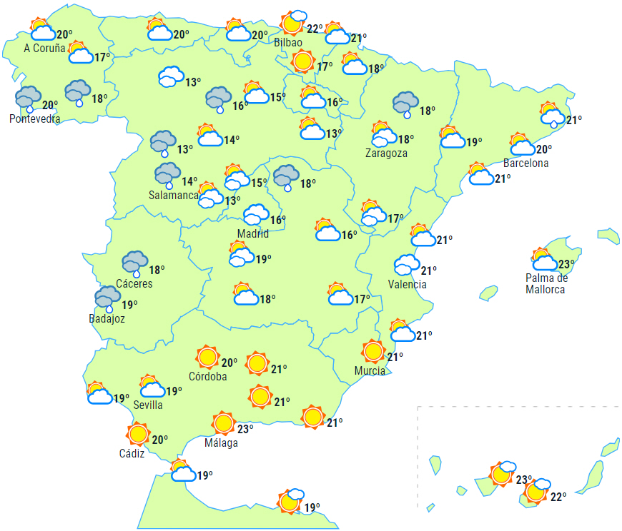 Varsler om lokalt heldagsregn i den nordlige del af Extremadura, mens der kan komme byger i Catalonien, Pyrenæerne og De Iberiske Bjerge, og det kan blive ledsaget af tordenvejr.