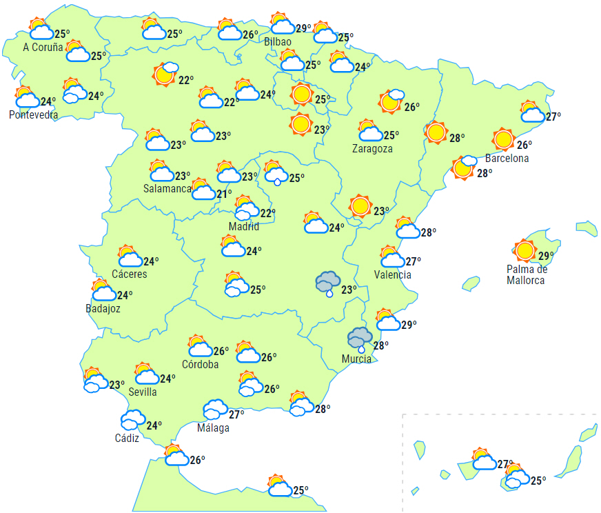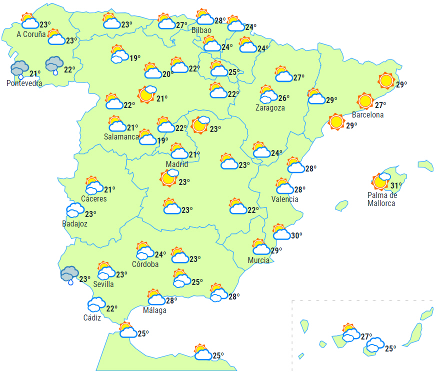Dagstemperaturerne vil stige på den centrale og sydlige del af halvøen, samt i den vestlige ende af nordvestkysten og på De Kanariske Øer, mens de vil falde på den nordøstlige del, i Levante-området og på De Baleariske Øer. Kun små ændringer i resten. Nattemperaturerne vil stige i Galicien, det vestlige Andalusien og Extremadura samt på De Kanariske Øer. Faldende i resten af landet.
