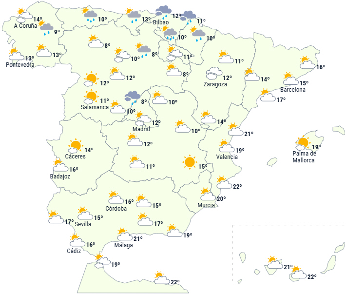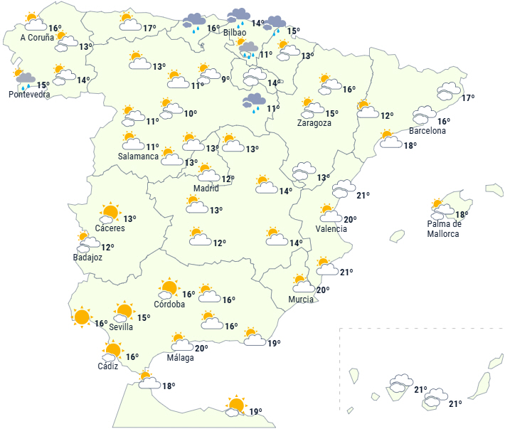 Kun den helt nordlige del af halvøen vil forblive under indflydelse af passage af flere fronter, der bringer rigeligt med skydække og let nedbør i Galicien, Cantabrian og Pyrenæerne.
