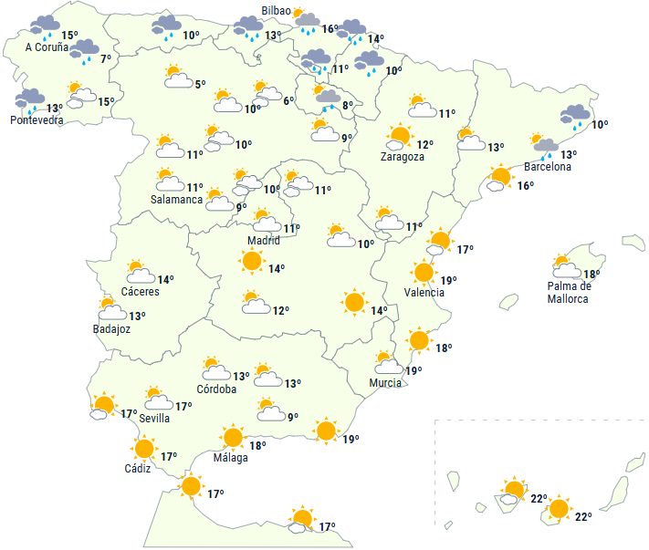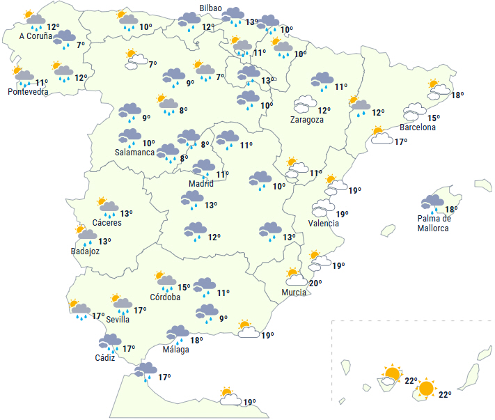 I dag vil en front passere hen over halvøen og give overvejende skyet eller overskyet himmel og nedbør, der bevæger sig fra vest til øst og når De Baleariske Øer i løbet af eftermiddagen.
