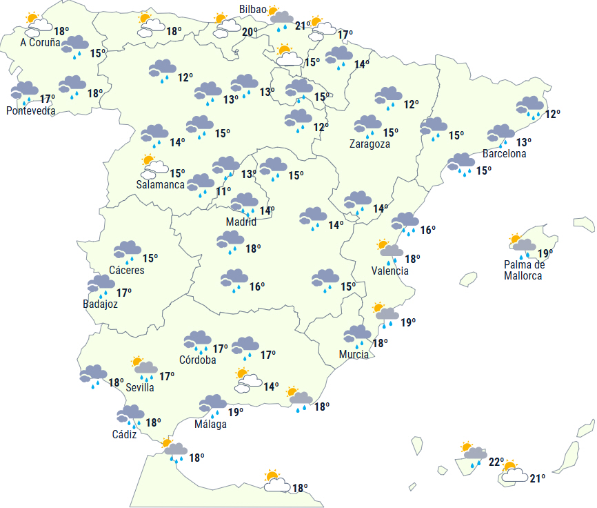 Ustabiliteten vil fortsætte på Den Iberiske Halvø og De Baleariske Øer med overskyet himmel og udbredt nedbør, der vil blive ledsaget af lejlighedsvis torden i centrum og syd og måske også ved Det Cantabriske Hav.