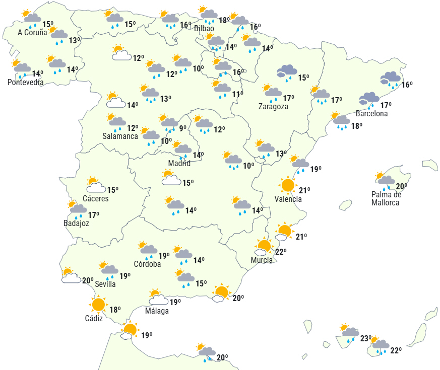 Passagen af frontsystemer kombineret med dannelsen af et lavtrykssystem i det nordlige Middelhav vil give en dag præget af ustabilitet på Den Iberiske Halvø og De Baleariske Øer, med skyet eller helt overskyet himmel. Om eftermiddagen er der dog tendens til opklaring.