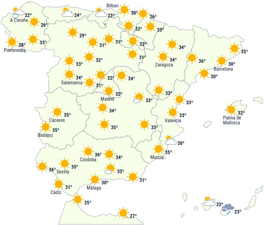 Spanien tager hul på en ny uge, og de høje temperaturer fortsætter med op til 40 grader nogle steder i syd, mens nord får regn og torden. Øerne får kraftig vind og lette byger.