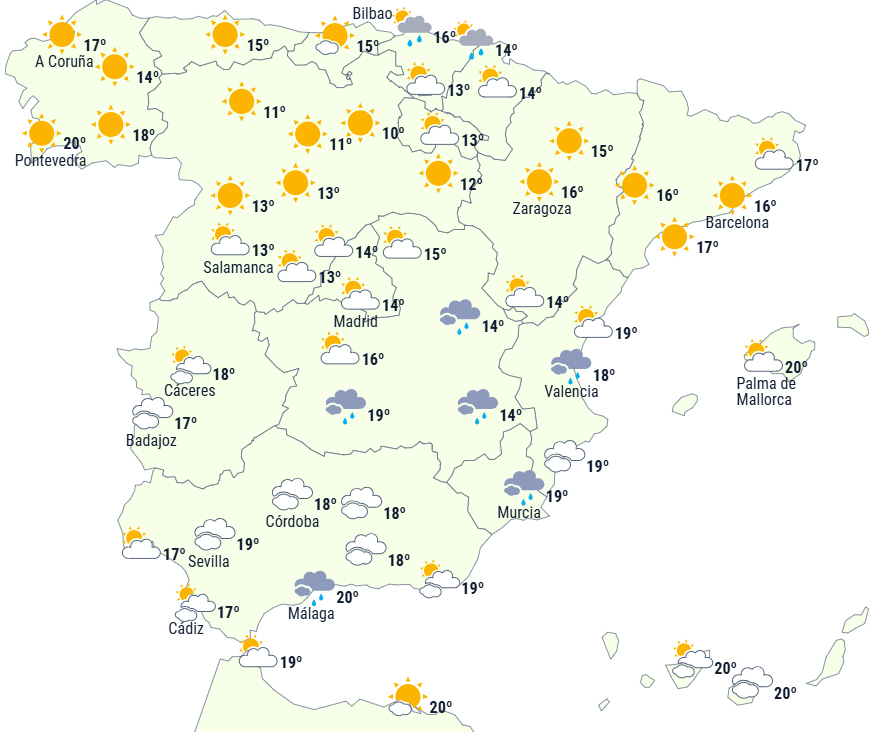 Stabilisering af vejret på halvøen og De Baleariske Øer med letskyet eller klar himmel over den nordlige del af halvøen. Over den sydlige del vil der derimod være overvejende skyet himmel i dagens første halvdel, men dog tendens til opklaring, efterhånden som dagen skrider frem.
