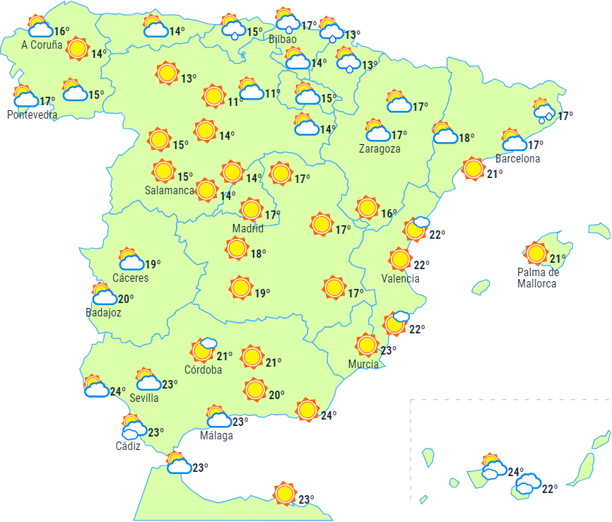 Kun længst mod nord forventes en overskyet himmel med en tendens til opklaring i den vestlige halvdel, mens det er mere vedvarende i øst med nedbør ved nordvestkysten, i Pyrenæerne og det nordøstlige Catalonien - lejlighedsvis ledsaget af tordenvejr. Sne i Pyrenæerne i højder fra 1.400/1.800 meter, men efterhånden stiger snegrænsen til 1.800/2.000 meter.