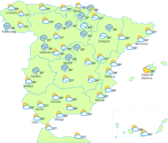 Flere fronter forventes at feje hen over det meste af halvøen og give skyet eller overskyet himmel og nedbør ledsaget af tordenvejr. Der forventes kraftige og/eller vedvarende byger i den vestlige del af Galicien, Castilla y León, Castilla-La Mancha og Andalusien samt i områder af Extremadura og Pyrenæerne. Mindre sandsynligt og i hvert fald kun svagere nedbør det sydøstlige indre af halvøen, Valencia og den vestlige del af den cantabriske kyst. Det ventes at holde tørt på sydøstkysten.