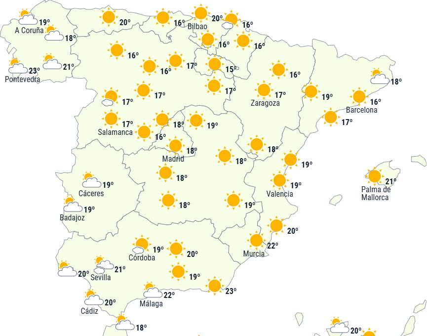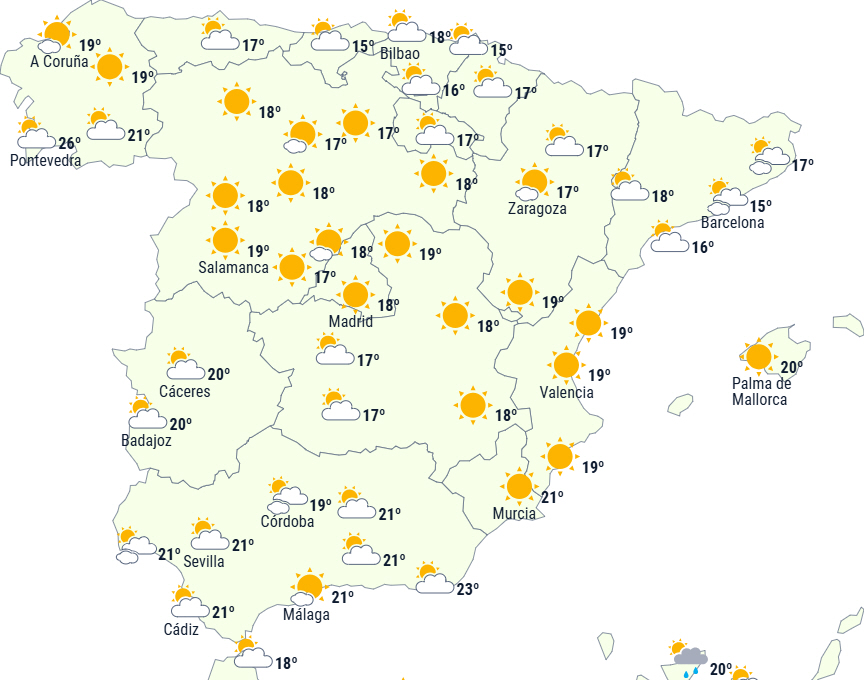Den Iberiske Halvø forventes at opleve stabilt vejr med klar eller letskyet himmel, bortset fra kystområderne ved Cantábrico og Middelhavet, hvor der vil være lavthængende skyer og morgendis. Eftermiddagen vil bringe flere højtliggende skyer i de vestlige og nordlige områder samt efterhånden også tiltagende skydække i indlandet.