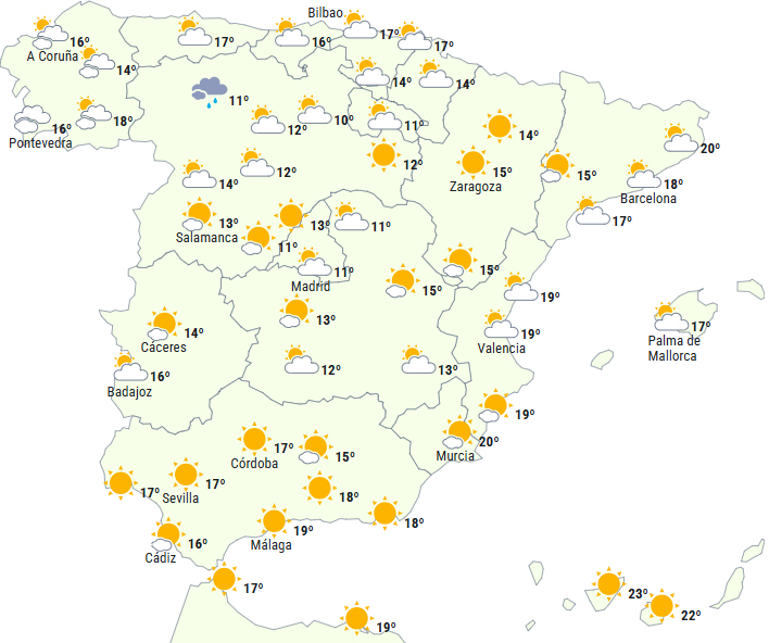 Kun letskyet eller overskyet himmel over den nordvestlige tredjedel af halvøen og i bjergene på den nordlige Atlanterhavsside, der en Atlanterhavsfront nærmer sig, og det vil give svag nedbør i Galicien og det vestlige af det cantabriske område.