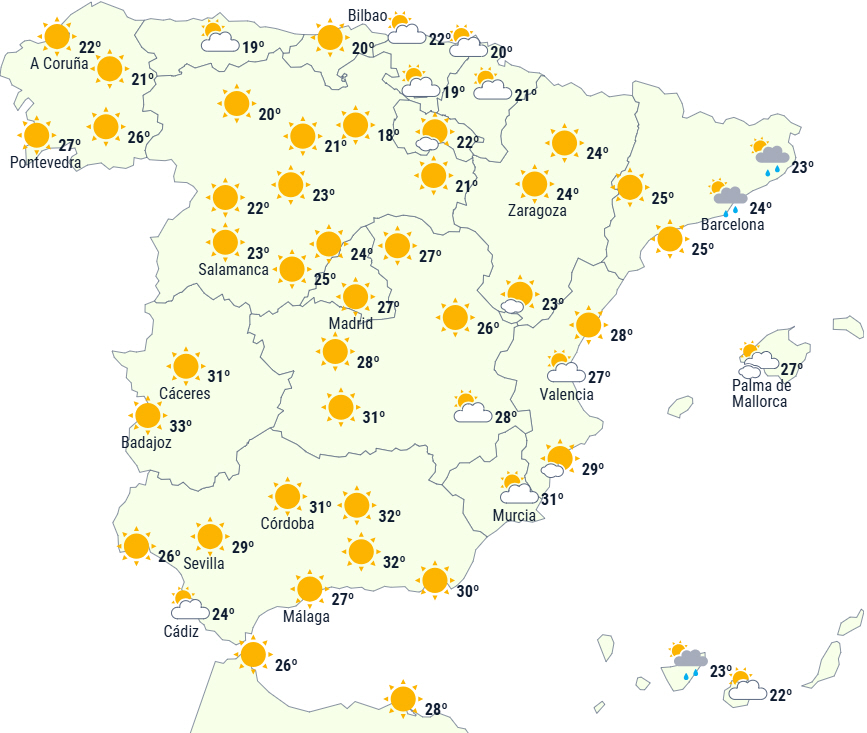 Dagstemperaturerne vil let falde langs middelhavskysten og på øgrupperne, mere markant på det sydvestlige Den Iberiske Halvø, mens de stiger i resten af landet.