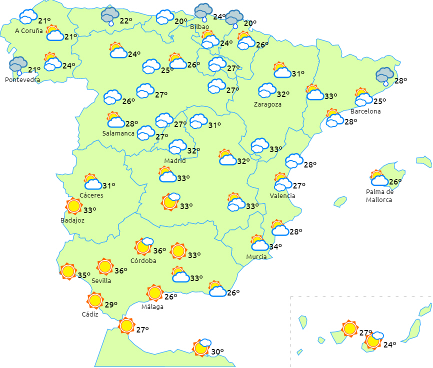 Overvejende overskyet vejr med let regn til den helt nordlige del af halvøen. Skyet i perioder omkring den nordlige højslette. Der bliver også skyet i den nordlige del af Catalonien og på den nordøstlige del af halvøen, hvor der kan komme enkelte byger.