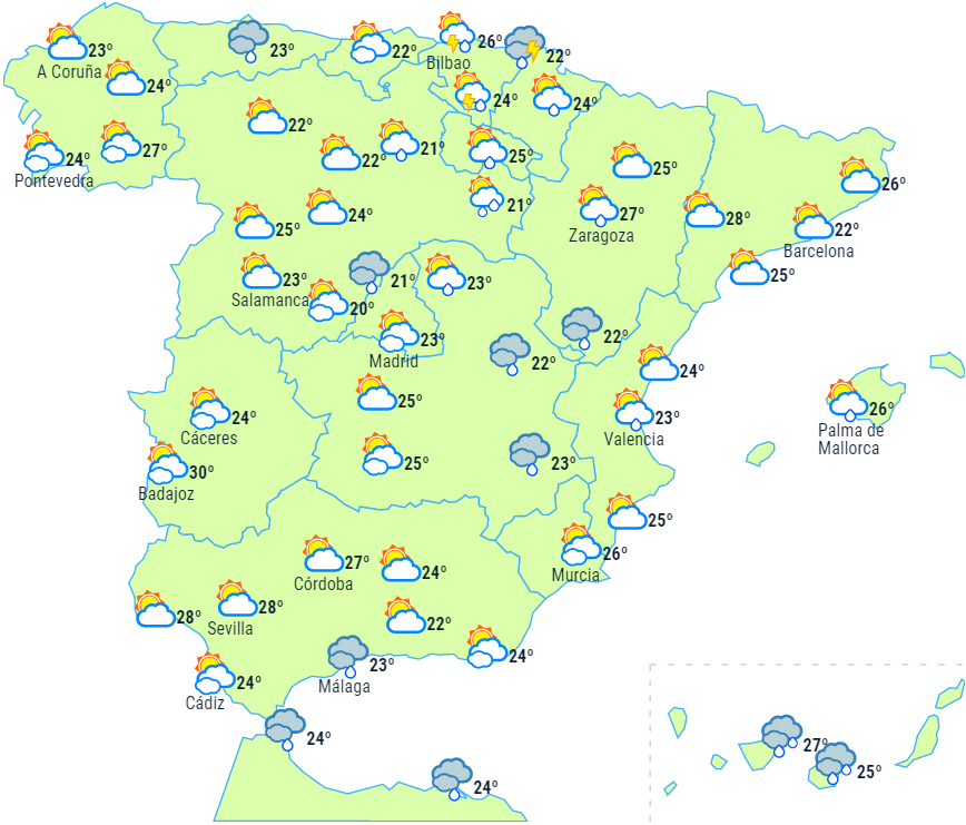 Óscar har vist sig at være en relativt vedholdende herre, og uvejret forventes fortsat at give rigeligt med skyer over halvøen med nedbør og torden, der vil brede sig i løbet af dagen fra vest til nordøst uden dog helt at nå Levante-området og Balearerne, hvor man slipper med vekslende skydække.