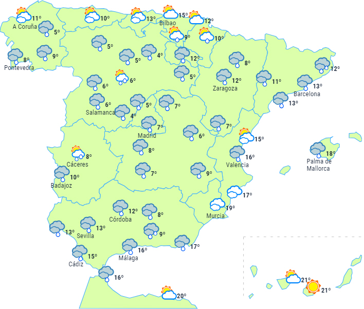 På halvøen og De Baleariske Øer forventes to lavtryk at sende flere fronter ind over landet. Derfor ventes skyet eller overskyet himmel og stort set udbredt nedbør, dog mindre intens nedbør til den sydøstlige del halvøen.