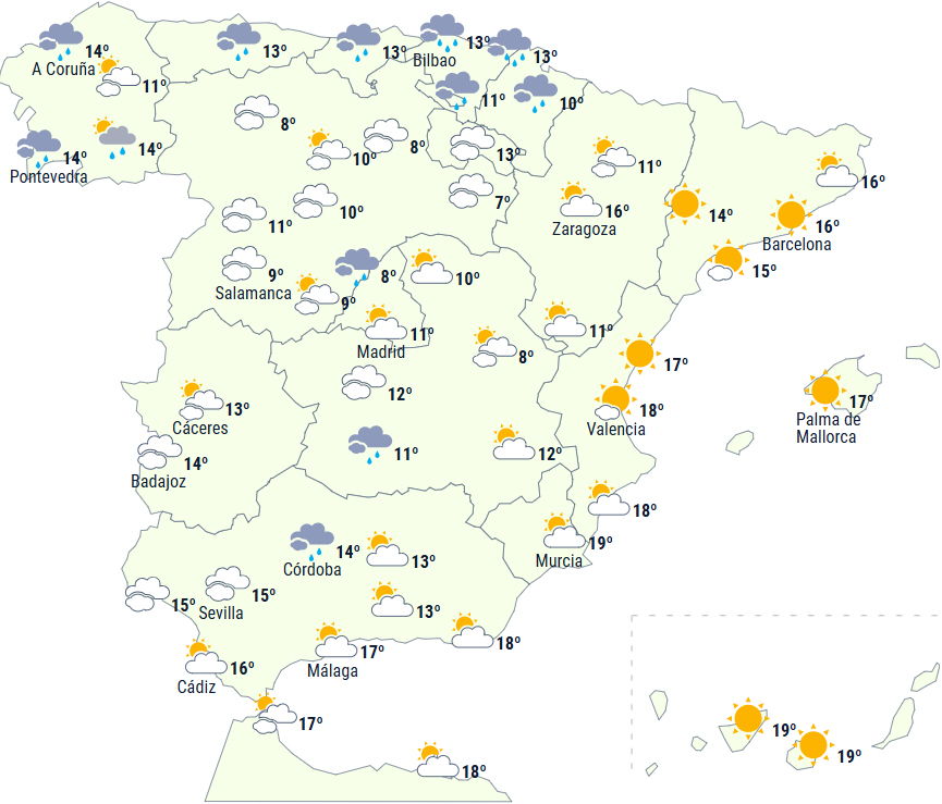 Efter passagen af koldfronten i går bliver der nu etableret et højtryk over halvøen og De Baleariske Øer. Ud over heldagsregnen i Cádizbugten og Gibraltarstrædet får det nordlige af halvøen overvejende overskyet himmel med mulighed for svag og spredt nedbør, mens det forventes at holde tørt på den østlige del af halvøen og Balearerne.