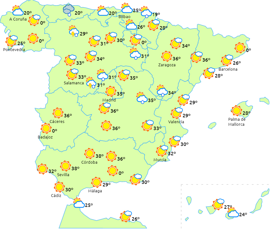 Dagstemperaturerne vil stige på halvøens Atlanterhavsside og i den nedre Ebro-dal, mens de falder i den sydlige halvdel af Middelhavsområdet, ved nordvestkysten og i resten af Ebro-dalen. Kun få ændringer i resten, ligesom der heller ikke sker noget nævneværdigt med minimumstemperaturerne.