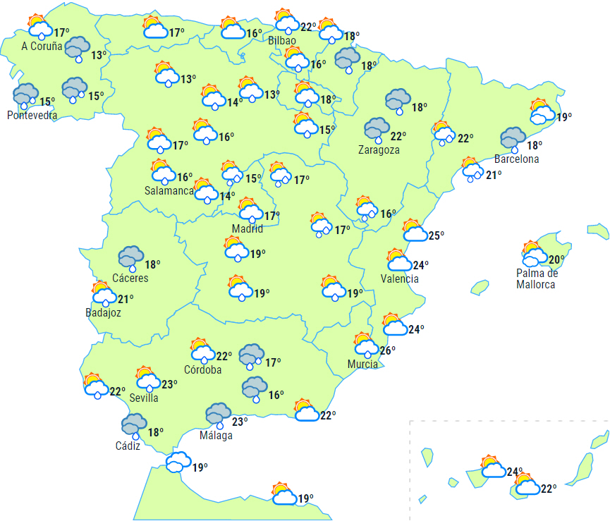 En front trækker hen over halvøen og giver skyet eller overskyet vejr på Atlanterhavssiden med nedbør, som i Galicien og i de vestlige af de centrale bjerge lokalt kan være kraftig eller vedvarende. Skyerne og nedbøren vil i løbet af dagen brede sig fra vest mod øst hen over resten af halvøen, bortset fra det helt sydøstlige område, hvor der ikke forventes regn, men kun lidt overskyet i perioder, samt på Balearerne.