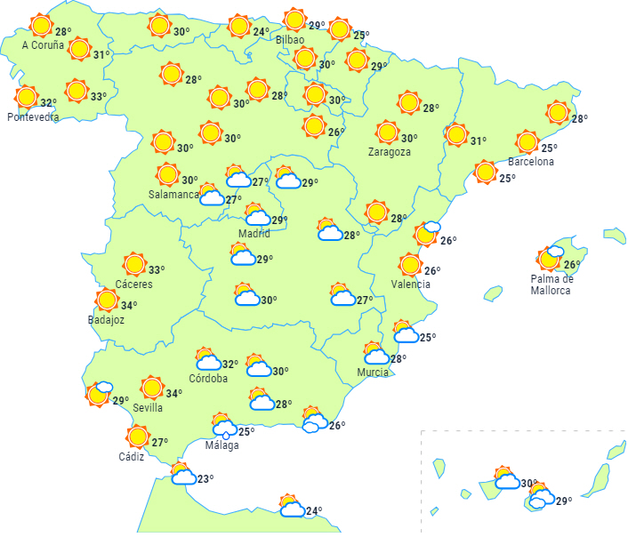 På det meste af halvøen og De Baleariske Øer vil der fortsat være stabilt vejr med letskyet eller klar himmel. Der forventes kun nogle lavthængende morgenskyer ved Galiciens kyster og Det Cantabriske Hav, Middelhavsområdet og det indre af den sydøstlige del af halvøen med mulighed for lokal morgentåge og måske lidt svag og spredt regn i områderne ved Gibraltarstrædet.