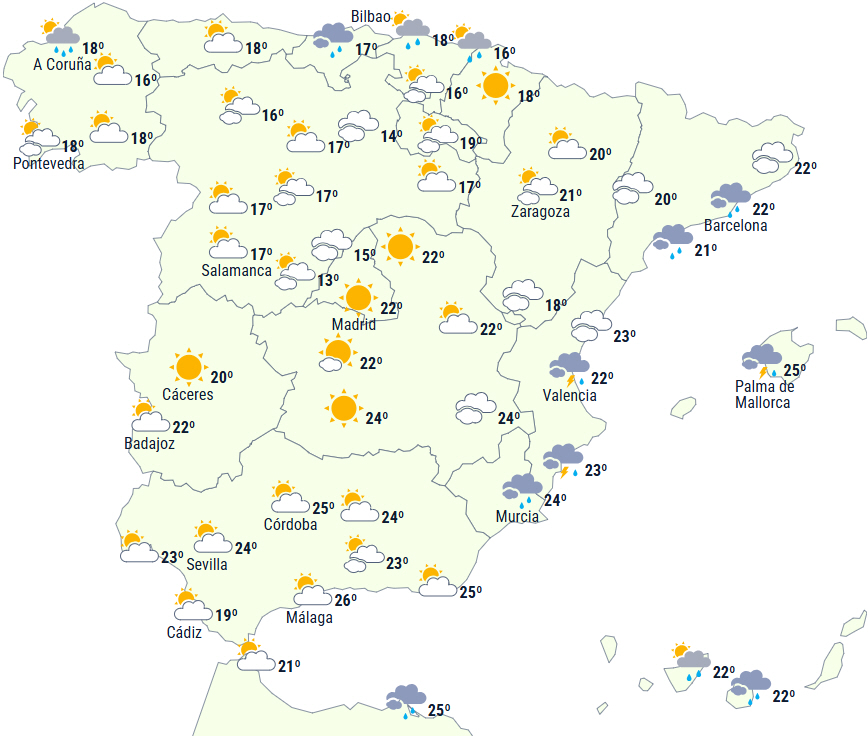 Der forventes også nedbør og overskyet himmel i Galicien og det cantabriske område på grund af passagen af en atlantisk front, som også kan give betydelige nedbørsmængder i det vestlige Galicien og på de østlige cantabriske kyster. Det udelukkes ikke, at det lejlighedsvis også kan regne andre steder på halvøen, hvor letskyet vejr vil dominere med undtagelse af den sydvestlige del, hvor der generelt er klar himmel.