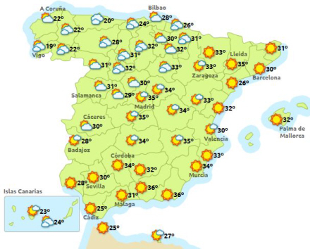 I store dele af Centralspanien og i Sydspanien ligger termometret flere steder og svinger omkring de 40 grader.