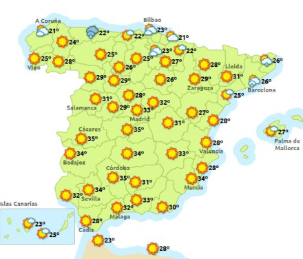 Hedebølgen topper på onsdag med 35 grader i Huelva og Jaén, 36 grader i Madrid, 37 i Sevilla, 38 i Badajoz og Ciudad Real, og 39 i Toledo og Córdoba I yderligere 17 provinser vil temperaturen stige til mere end 30 grader, mens nat-temperaturen kun vil ligge under 20 grader i 19 provinser.