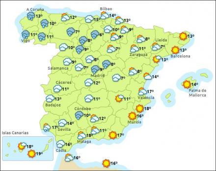 Madrid får overskyet og let nedbør med 11-13 grader, Barcelona letskyet og 7-13, Valencia letskyet 16-18 og Málaga letskyet med 12-17 grader.
