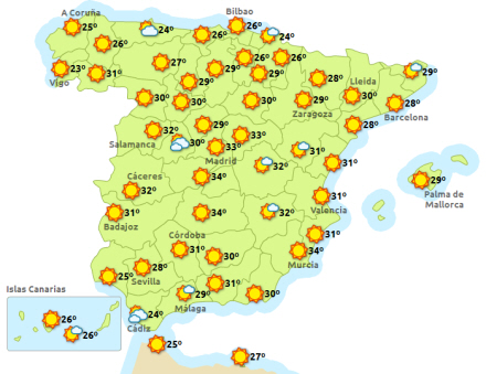 Gennemsnitstemperaturen er faldet til under de 35 grader, og laveste nattemperatur lå i går på 5,6 grader i Puerto de Leitariegos, (Asturias). Ellers falder nattemperaturen de fleste steder til mellem ni grader i Burgos og 23 grader i Alicante, Málaga og Melilla.